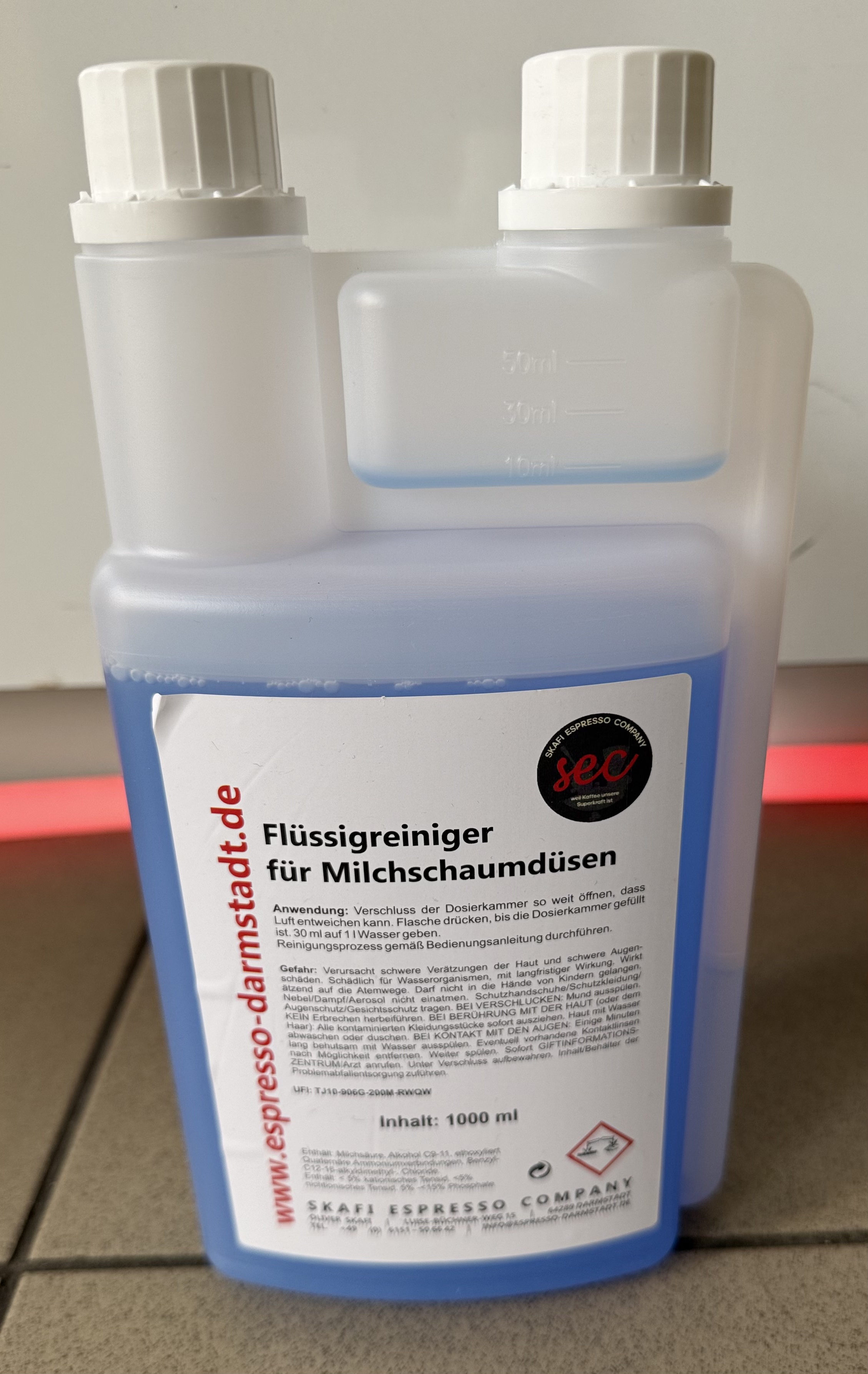 Milchschaumreiniger (blau) in der praktischen Dosierflasche für die meisten Kaffeevollautomaten mit Milchsystemen oder Eismaschinen (Speiseeis). 1 Liter